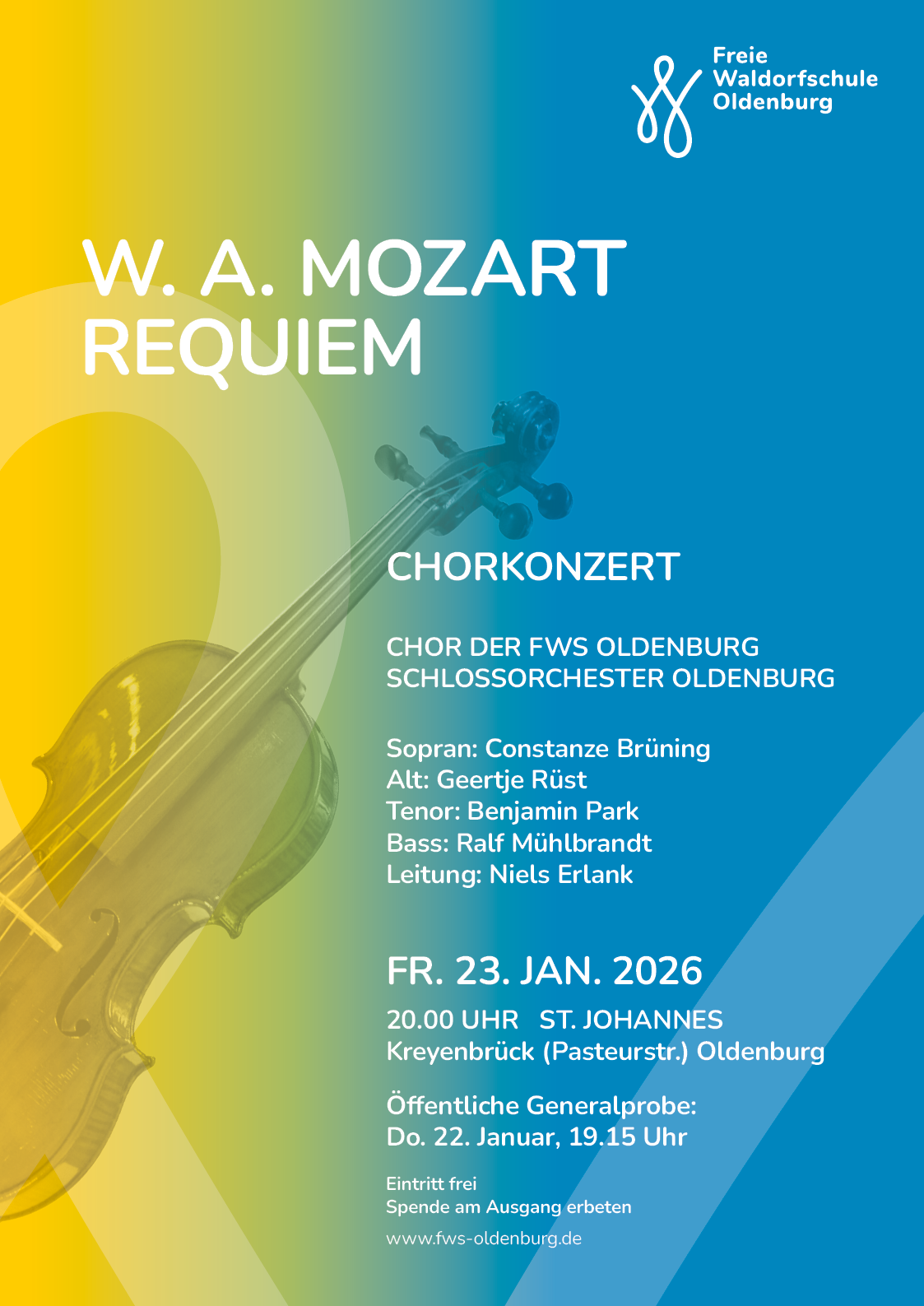 W. A. Mozart – Requiem Chorkonzert der Freien Waldorfschule Oldenburg Am Freitag, den 23. Januar 2026 um 20.00 Uhr erklingt in der St.-Johannes-Kirche, Kreyenbrück (Pasteurstraße), Oldenburg, eines der bewegendsten Werke der Musikgeschichte: das Requiem von Wolfgang Amadeus Mozart. Es musizieren der Chor der Freien Waldorfschule Oldenburg und das Schlossorchester Oldenburg unter der Leitung von Niels Erlank. Als Solistinnen und Solisten sind Constanze Brüning (Sopran), Geertje Rüst [...]