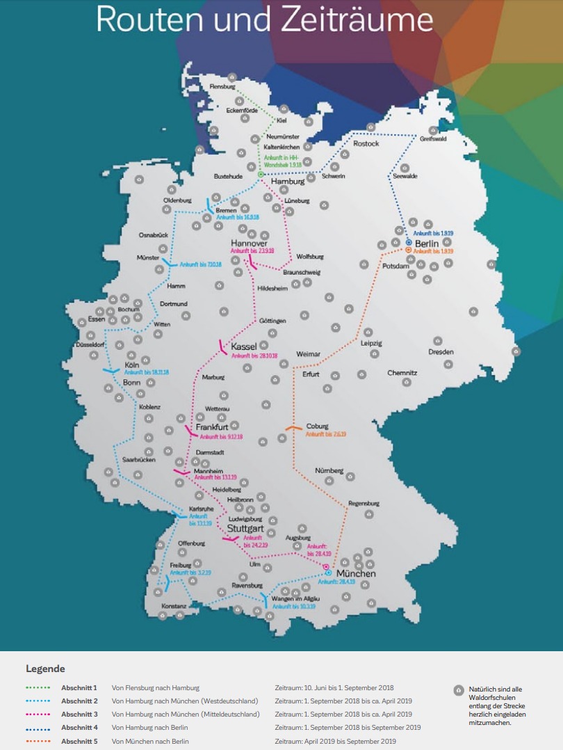 In Deutschland wollen Schülerinnen und Schüler zahlreiche Etappen auf verschiedenen Routen laufen, um so möglichst viele Spenden für förderungswürdige Waldorfprojekte in der Welt zu sammeln.
